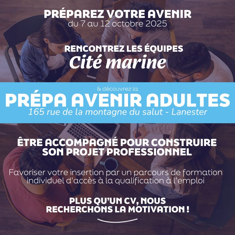 Vous êtes demandeur d’emploi ou salarié à temps partiel & souhaitez construire votre futur projet professionnel ? Les équipes de Cité marine & Retravailler vous accueillent & vous accompagnent du 7 au 12 octobre 2025 pour une présentation du dispositif PREPA Avenir Adultes.