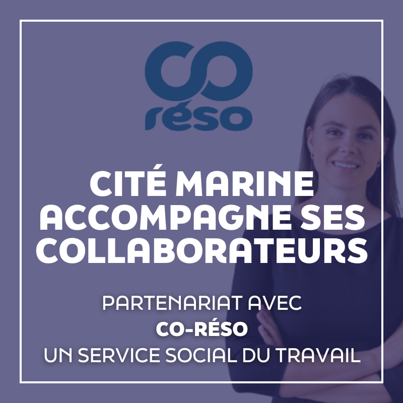Cité marine vient de nouer un partenariat avec CO-RÉSO, un service social du travail qui met à disposition des entreprises et de leurs salariés les compétences d’une assistante sociale. Depuis 1960, CO-RÉSO intervient dans les entreprises bretonnes, tous secteurs d’activité confondus (agroalimentaire, tertiaire, commerce, etc.).