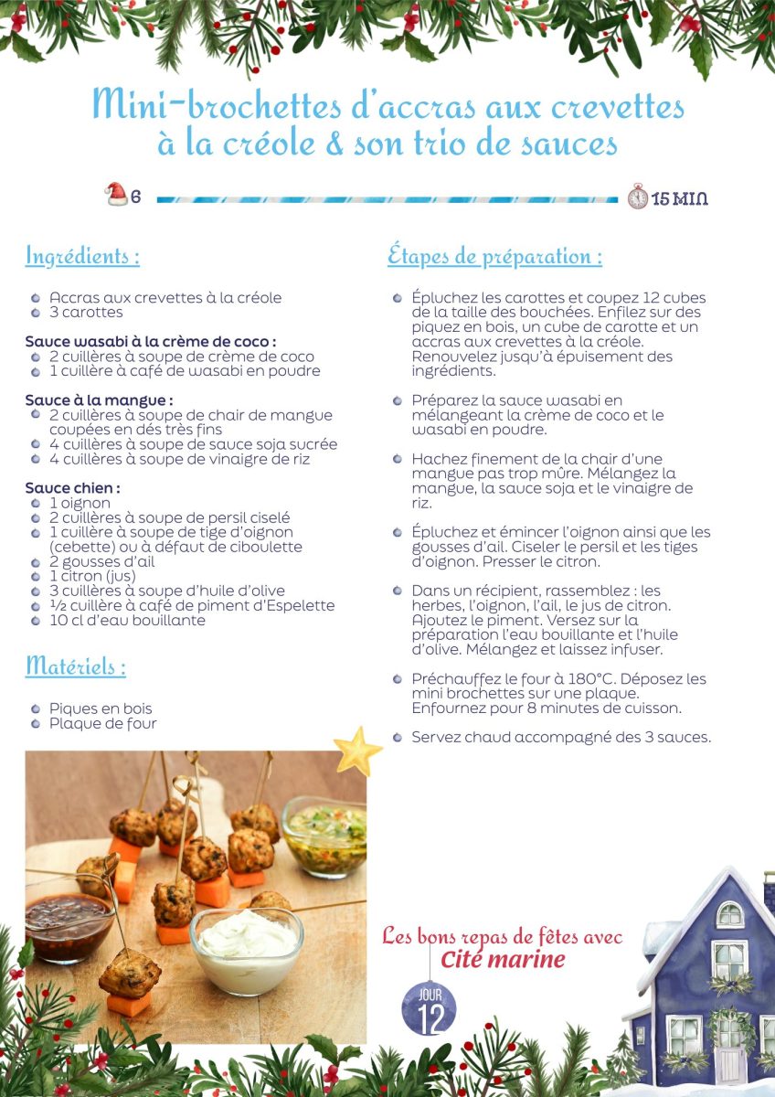 Épluchez les carottes et coupez 12 cubes de la taille des bouchées. Enfilez sur des piquez en bois, un cube de carotte et un accras aux crevettes à la créole. Renouvelez jusqu’à épuisement des ingrédients.