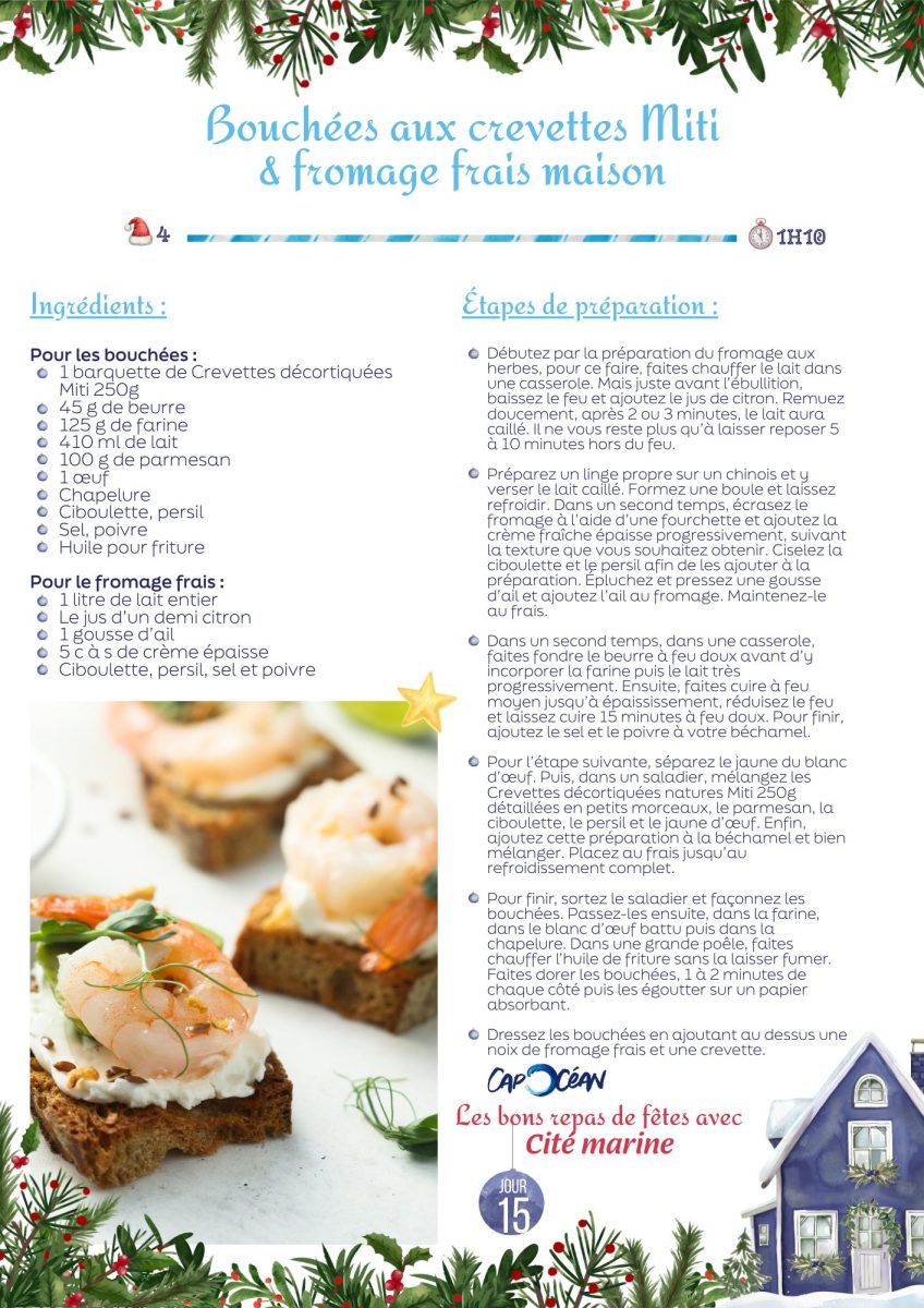 Dressez les bouchées en ajoutant au dessus une noix de fromage frais et une crevette.