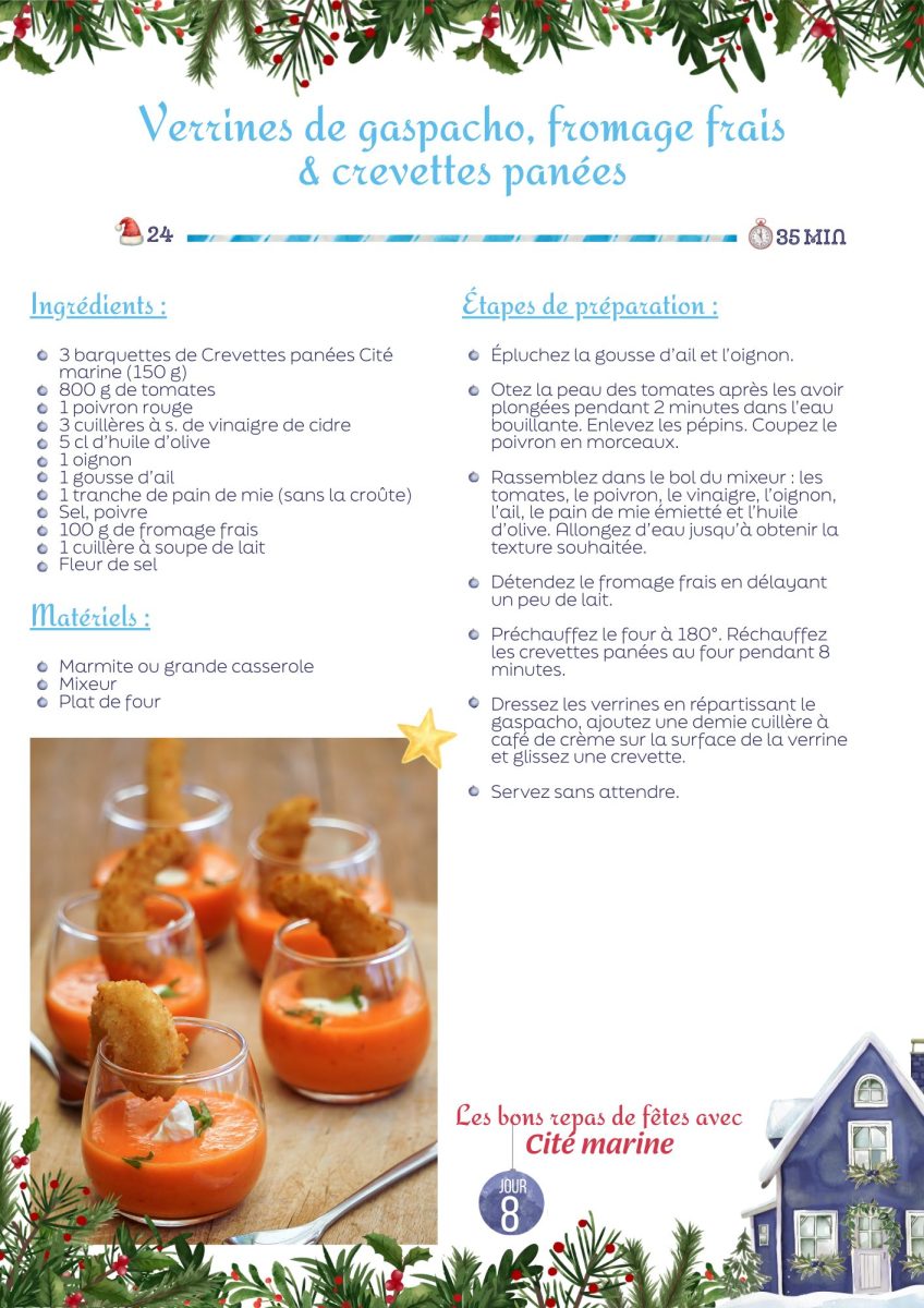 Vous aimez les entrées froides ? Vous souhaitez un peu d’Espagne sur votre table de Noël ou du nouvel An ? Succombez au gaspacho, fromage frais & crevettes panées !